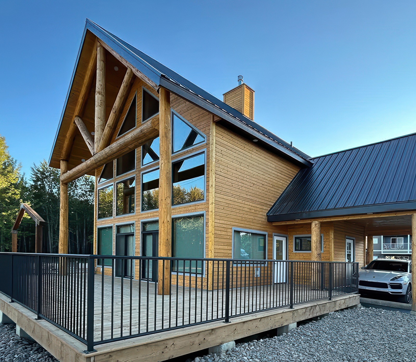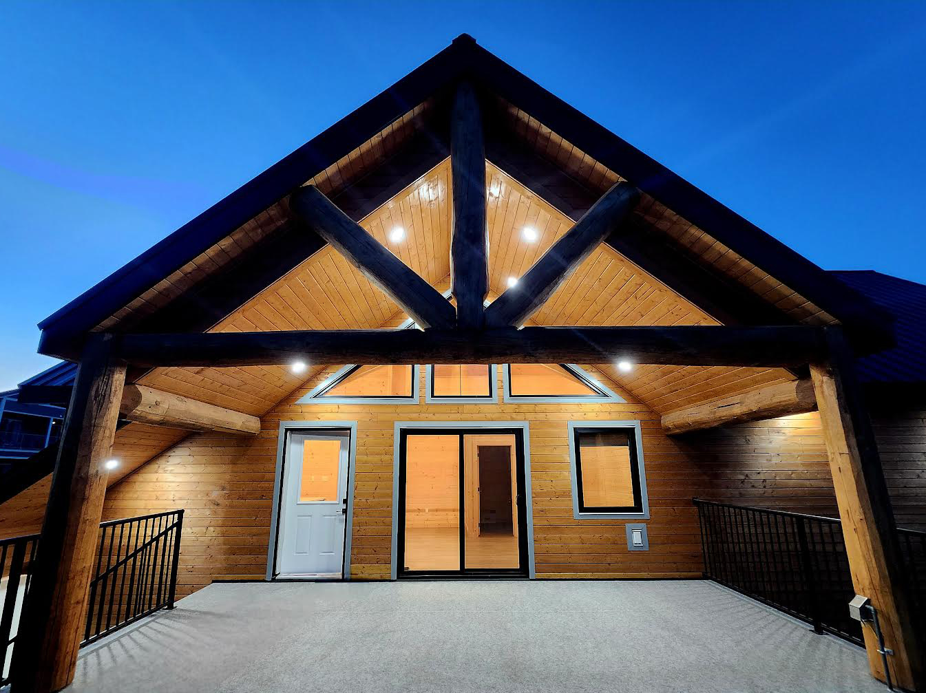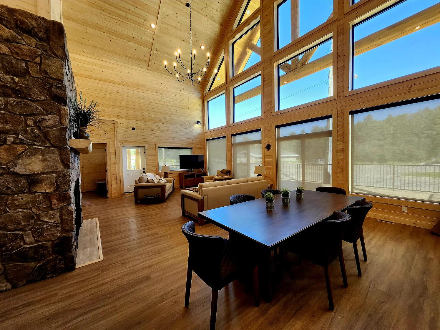 Suite A is the crown jewel of the property — a grand, open-concept space with soaring 25-foot ceilings, a rustic stone fireplace, and a pine-lined executive office. The great room features an A-frame window wall, allowing natural light to pour into the living space. Whether you're hosting a guest or just unwinding in comfort, this suite delivers northern luxury in full.